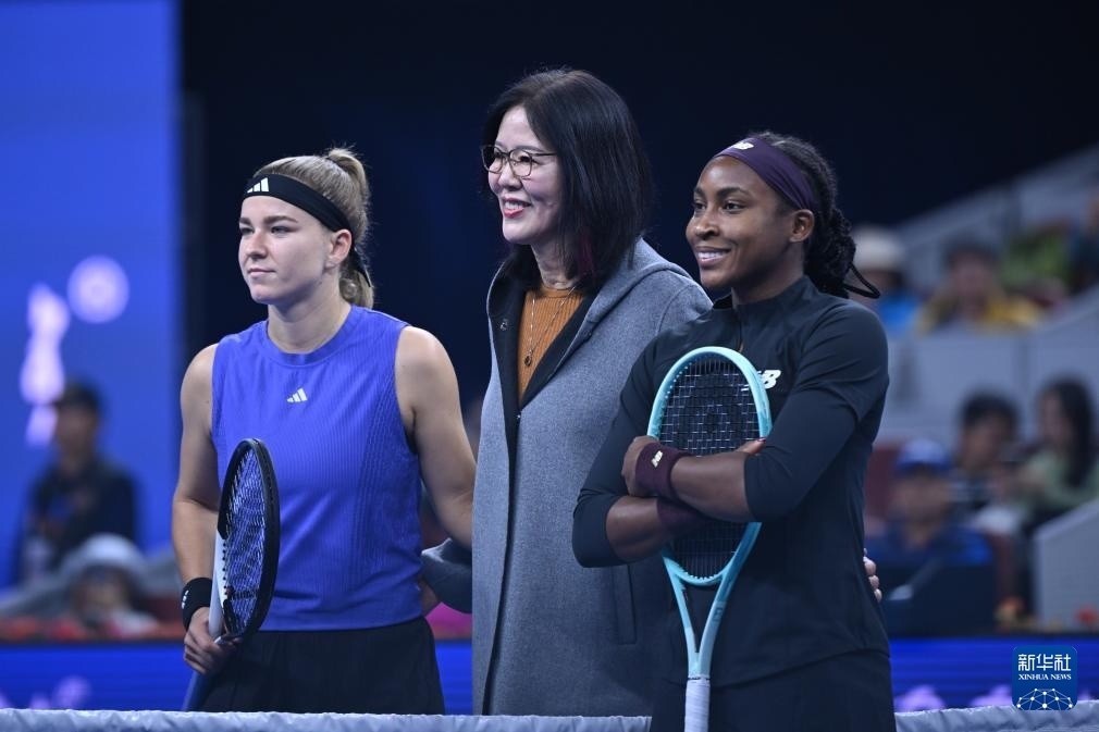 10月6日,高芙(右)、穆霍娃(左)与本场比赛挑边嘉宾郎平在赛前合影。